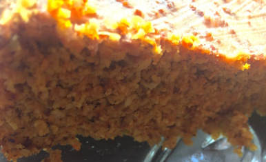 6) Das Finish: Erythrit-Puderzucker mit dem Saft der Zitrone verrühren. Jetzt den aufgefangenen Karottensaft solange zugeben bis eine cremige Masse entsteht. Den ausgekühlten Kuchen mit einem Pinsel glasieren. Glasur trocknen lassen, fertig!